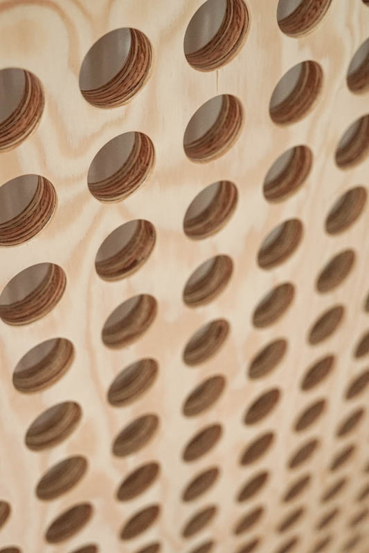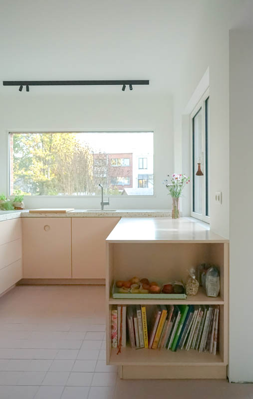 De combinatie van de zachte kleur van het lakwerk en de brutere uitstraling van de multiplex zorgen voor een evenwichtig geheel.